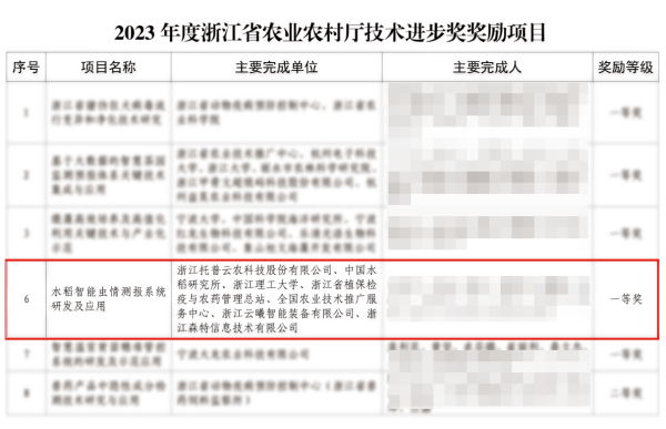 近日,加快建設(shè)創(chuàng)新浙江因地制宜發(fā)展新質(zhì)生產(chǎn)力動員部署會暨全省科學(xué)技術(shù)獎勵大會在杭州舉行。大會公布并表彰了2023年度浙江省科學(xué)技術(shù)獎。其中,由浙江托普云農(nóng)科技股份有限公司(股票簡稱:托普云農(nóng),股票代碼:301556)牽頭完成的《水稻智能蟲情測報系統(tǒng)研發(fā)及應(yīng)用》成果榮獲2023年度浙江省科學(xué)技術(shù)進(jìn)步獎三等獎。這是該項成果繼榮獲“2023年度浙江省農(nóng)業(yè)農(nóng)村廳技術(shù)進(jìn)步獎一等獎”之后斬獲的第二個重磅獎項,充分展現(xiàn)了托普云農(nóng)在農(nóng)業(yè)科技創(chuàng)新領(lǐng)域的卓越實力。